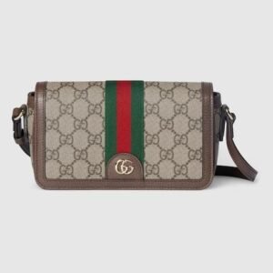 Description The Ophidia collection evokes the House’s heritage with the signature Web stripe and Double G emblem in light gold-toned finish. The styles are crafted from soft GG Monogram coated fabric, featuring green cotton lining inside. The flap features an emblematic Web trim. Product Details Beige and dark brown GG Monogram coated fabric Brown leather...