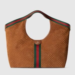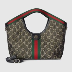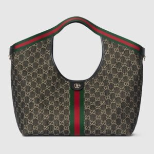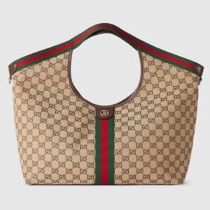 Description Unveiled during the Cruise 2026 fashion show in Florence, Gucci Giglio is a tribute to the House’s Italian roots, and the spirit of continuity and reinvention. Crafted in GG canvas, this capacious tote features the Web trim, and is complete with a detachable pouch. Online exclusive Beige and dark brown GG canvas Green and...