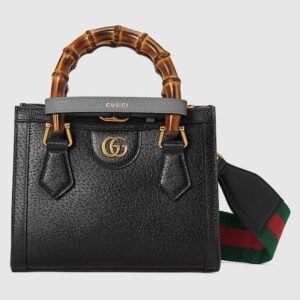 Description An evolution of a bamboo handle tote first introduced in 1991, the Gucci Diana represents the notion of style in constant evolution and is reimagined with removable, neon leather belts—a nod to the functional bands used to keep the handles in shape. Black leather Shiny antique gold-toned hardware This item comes with 2 decorative...
