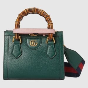 Description An evolution of a bamboo handle tote first introduced in 1991, the Gucci Diana represents the notion of style in constant evolution and is reimagined with removable, neon leather belts—a nod to the functional bands used to keep the handles in shape. Green leather Shiny antique gold-toned hardware This item comes with 2 decorative...