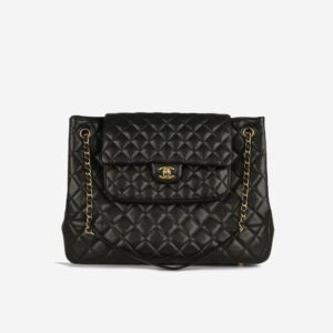 Description Exterior Black quilted caviar leather Antique Gold-tone hardware Flap pocket at the front with CC twistlock closure Slip pocket at rear of bag Interwoven chain / leather shoulder straps Excellent condition – slight colour discolouration to exterior / leather creases to exterior Interior Black calfskin / fabric lining Inner zip pocket Two slip pockets...