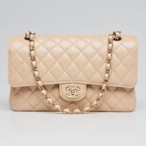 Chanel Beige Quilted Caviar Medium Classic Double Flap Bag Gold Hardware