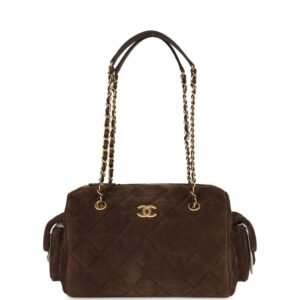 Description This Chanel Small Bowling Bag is in dark brown suede with antique gold hardware, featuring signature diamond quilt, a front CC antique gold tone logo on the front, two exterior side pockets, and two Interwoven antique gold and dark brown leather top handles. The interior is lined in dark brown grossgrain fabric and has...