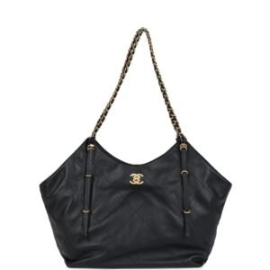 Description This Chanel Small Coco Shopping Tote bag is in black calfskin leather with antique gold hardware featuring large flat diamond quilt leather, a front cc turnlock closure, a removable pouch, and interwoven antique gold tone chain link and black leather shoulder straps. The interior is lined in black cotton and leather with no interior...