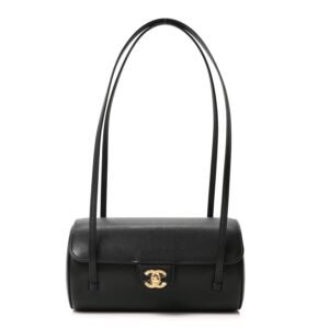 Description This is a CHANEL Shiny Caviar Preppy Coco Small Bowling Bag in Black. This lovely shoulder bag is crafted of shiny calfskin leather. The bag features gold CC logo on the front flap and rolled leather top handles. The flap opens to a black leather interior with a patch pocket. Base length: 8 in...
