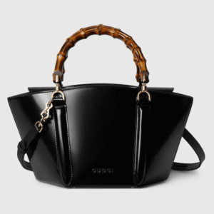 Description Introducing a bamboo top handle bag, this style from the women’s Fall Winter 2024 runway blends the House’s expert craftsmanship with its iconic motif. The basket-shaped bag reveals a hexagonal base, highlighting its artisanal construction. The small size in black is complete with a detachable shoulder strap. Black shiny leather Embossed Gucci logo Hexagonal...