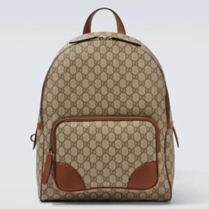 Description this medium Gucci backpack features a fabric material with leather trim and fabric lining. The design is defined by the brand’s GG emblem and gold-tone hardware. It features adjustable shoulder straps, a zipped top closure, an internal slot pocket, and an internal zipped pocket. The bag includes a dust bag. Material fabric, leather Includes...