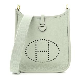 Description This is an authentic HERMES Taurillon Clemence Amazone Evelyne TPM in Gris Neve. This messenger bag in the smallest size of this model is crafted of taurillon calfskin leather in a light green. The bag features a canvas body strap, polished gold hardware, and a perforated Hermes H oval logo. The top of the...
