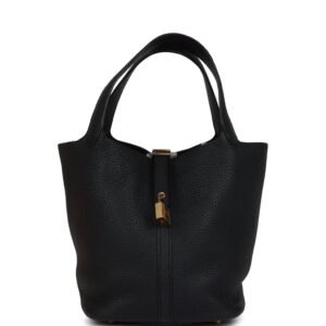 Description This Picotin Lock 22 is in Black clemence leather with gold hardware and has tonal stitching with two top handles. The interior is lined with Black natural leather, no interior pockets and has a pull through closure secured by padlock. Measurements : 8.3″ width x 8.7″ height x 6.7″ depth/21x22x17cm; 5″ handles