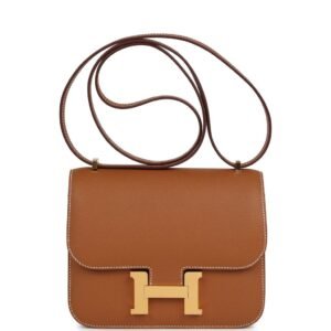 Description Description This Constance 1-18 is in Gold epsom leather with gold hardware and has contrast stitching, a metal “H” snap lock closure and adjustable shoulder strap. The interior is lined with Gold lambskin and has two open pocket on the front wall, a removable mirror, a center divide, and a slit pocket on the...