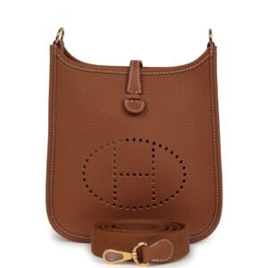 Description This Evelyne TPM is in Gold clemence leather with gold hardware and features contrast stitching stitching, pull tab top closure and a removable Gold canvas and leather shoulder/crossbody strap. The interior is lined with Gold natural suede leather. Measurements: 6.75″ width x 7″ height x 2″ depth/17x18x5cm; 23″ strap drop