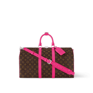 Description Brightly coloured leather details bring a fresh feel to this Keepall Bandoulière 50 travel bag in Monogram Macassar canvas. The top handles, the removable shoulder strap, even the leather name tag, are all in the same bright colour. The bag is lined in a striped textile inspired by the linings of the House’s original...
