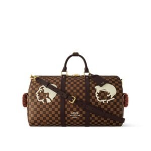 Description This reimagining of the classic Keepall Bandoulière 50 in Damier Phriendship canvas features pockets with flap closures at either end of the bag. Celebrating the decades-long collaboration with Japanese designer Nigo, Pharrell Williams prints their portraits on Damier Ebene canvas. The leather trim and the striking pattern of the lining complete the elegant design....