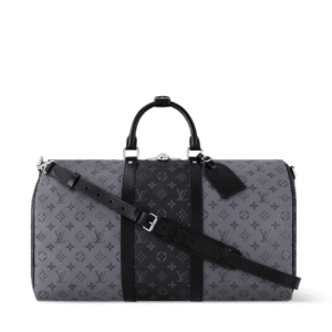 Description The Keepall Bandoulière 50 alternates blocks of dark Monogram Eclipse canvas with lighter Monogram Eclipse Reverse canvas to create a bold, masculine feel. This classic soft travel bag boasts leather top handles and two leather bands along the side, all in black, making it instantly recognisable. Cabin-friendly, it has an unexpectedly spacious interior. 50...
