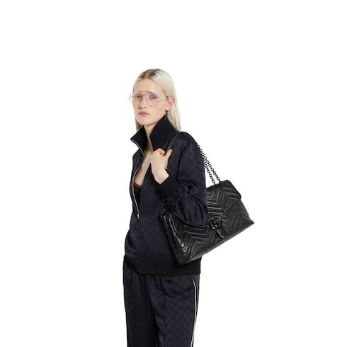 Description In the Fall Winter 2025 collection, the GG Marmont, a signature collection of the House, features the emblematic Double G, a faceted chain strap, and a soft, structured silhouette. This style is crafted from soft lightweight matelassé chevron leather and comes with a tonal enamelled hardware and chain. Black soft lightweight matelassé chevron leather Tonal enamelled hardware and chain Black viscose lining Double G Inside: zip pocket Sliding chain shoulder strap: 32 – 57cm drop W37.5cm x H21cm x D9cm Weight: approximately 0.8kg Made in Italy