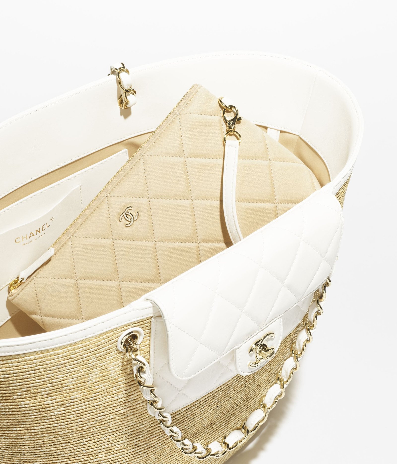 Description Material Braided Straw, Lambskin & Gold-Tone Metal Colors Beige & White Dimensions 10.2 x 21.3 x 7.1 in/cm Reference AS5952-B22647-U6022