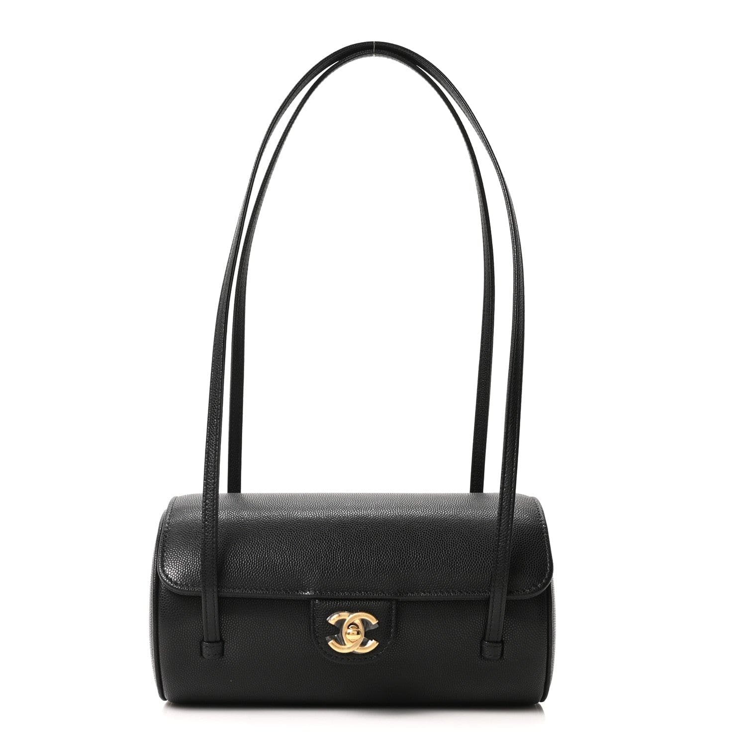 Description This is a CHANEL Shiny Caviar Preppy Coco Small Bowling Bag in Black. This lovely shoulder bag is crafted of shiny calfskin leather. The bag features gold CC logo on the front flap and rolled leather top handles. The flap opens to a black leather interior with a patch pocket. Base length: 8 in Height: 4.5 in Width: 4.5 in Drop: 11 in Size:20x11x11cm