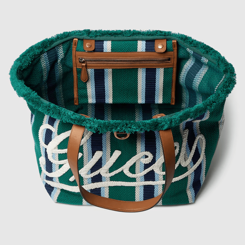 Description The Spring Summer 2025 men’s collection speaks of freedom, energy and community through the latest selection of travel pieces and men’s bags fit for new adventures. This tote bag appears in an eye-catching striped herringbone cotton canvas, complete with a Gucci script embroidery across the front. Green and multicolored striped herringbone cotton canvas Brown leather trim Gucci script embroidery Fringe detail 1 D-ring Top handle drop: 23cm W30cm x H29cm x D25cm Weight: 1.18kg approximately Made in Italy Fits a laptop, iPad, A4 notebook, and small items