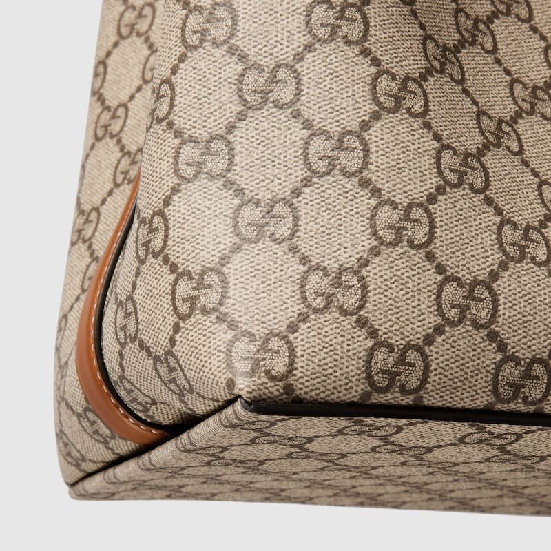Description The new GG Emblem collection reinterprets the House’s history of elegance and craftsmanship. This bucket bag highlights a functional design with two main compartments in Web cotton lining and a zip pocket in the middle. Beige and dark brown new GG Monogram coated fabric Brown leather trim with contrast stitching Green and red Web cotton lining The bag charm shown is sold separately and not included with the handbag. Inside: 2 main compartments with zip pocket in the middle Handle drop: 18cm Leather shoulder strap with 54cm – 60cm drop; Length: 105cm – 115cm Weight: 700g approximately W25cm x H25cm x D15.5cm Made in Italy The model is 177 cm tall Fits iPhone Pro Max/Plus, Airpods, long wallet, and lipstick