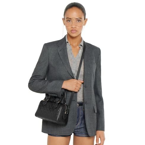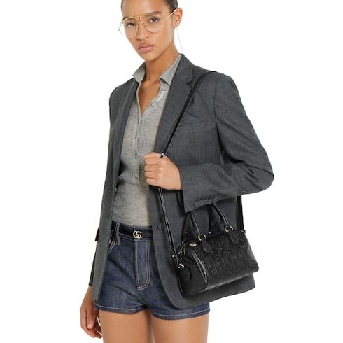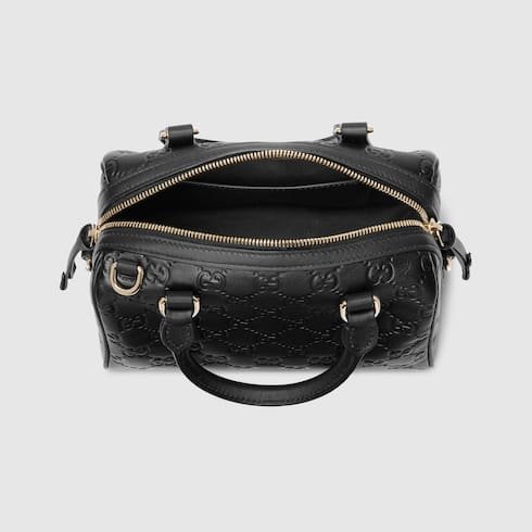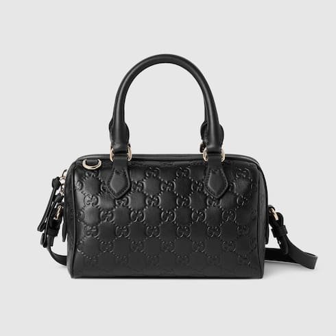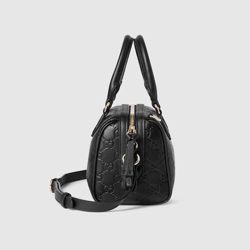 Description In the Fall Winter 2025 collection, the GG Emblem collection reinterprets signature motifs through creativity and innovative functions. This boston bag is crafted from emblematic embossed GG leather. The design comes with an adjustable leather shoulder strap and a secure zip closure. Product Details Black embossed GG leather Light gold-toned hardware Black cotton lining The bag charm shown is sold separately and not included with the handbag. Inside: open pocket Handle with 10.5cm drop Adjustable leather shoulder strap: 47 – 53cm drop; 112 – 127cm length Zip closure W20.5cm x H14cm x D11.5cm Weight: approximately 0.45kg Made in Italy Fits iPhone Pro Max/Plus, Airpods, long wallet, and lipstick