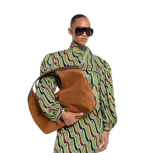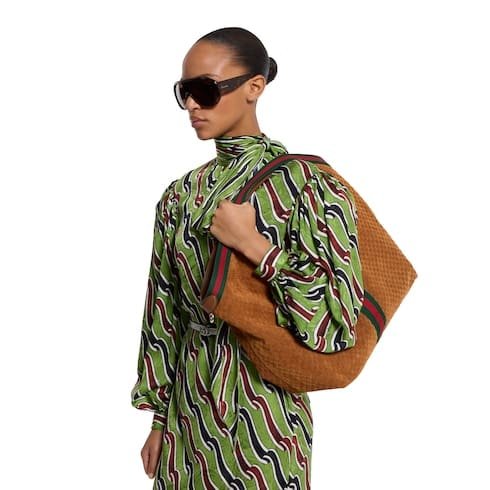 Description Continuing the spirit of reinvention, Gucci Giglio reinterprets the House’s emblematic GG motif with sumptuous materials and rich colors that speak to the season. Crafted in GG suede, this capacious bag features the Web trim, and is complete with a detachable pouch. Brown GG suede Green and red Web canvas trim Light gold-toned hardware Green cotton lining Double G Detachable pouch Outside: D-rings 7.1″ handle drop Hidden magnetic closure 16.5″ (23.6″)W x 18.5″H x 6.3″D/41.9 cm (60cm)× 47.0 cm × 16.0 cm Weight: 1.3lbs approximately Made in Italy Fits an iPad, iPhone, Airpods and small items