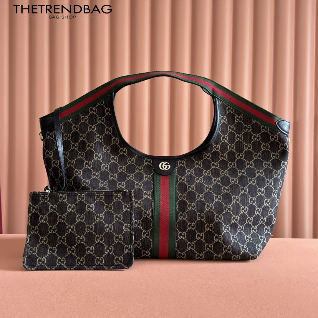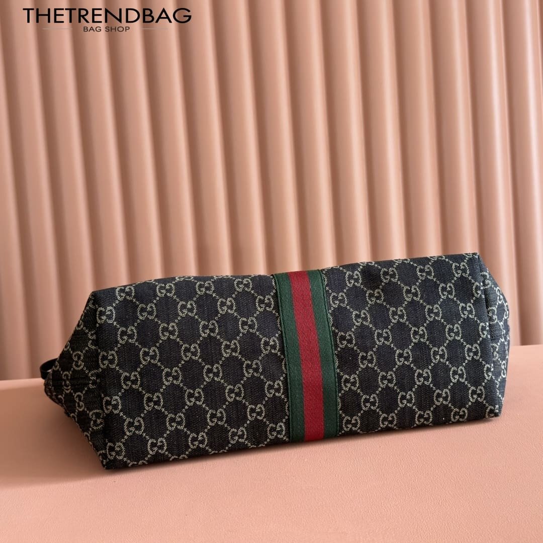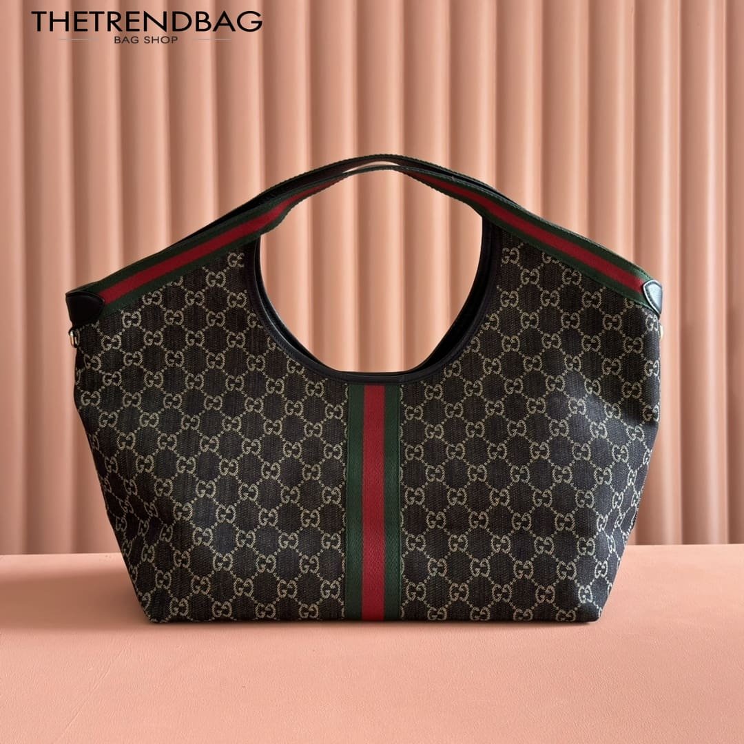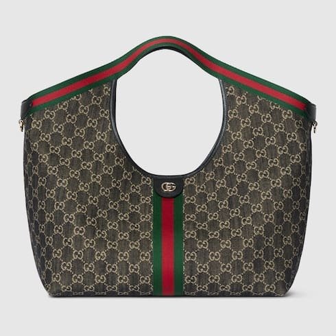 Description Gucci Giglio presents the black denim large tote bag, available exclusively online. The style is a tribute to the House’s Italian roots and the spirit of reinvention. Crafted in GG denim, this capacious bag features the Web trim, and is complete with a detachable pouch. Product Details Black and white GG denim Green and red Web canvas trim Light gold-toned hardware Black cotton lining Double G Detachable pouch Outside: D-rings 7.1″ handle drop Hidden magnetic closure 16.5″ (23.6″)W x 18.5″H x 6.3″D/41.9 cm (59.9 cm) × 47.0 cm × 16.0 cm Weight: 1.3lbs approximately Made in Italy Fits an iPad, iPhone, Airpods and small items