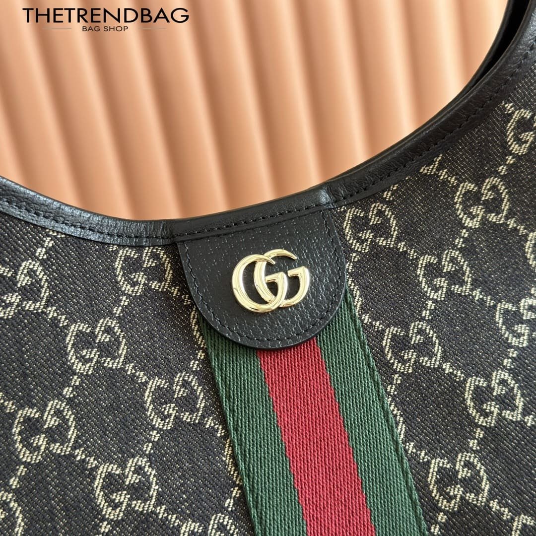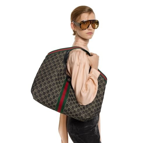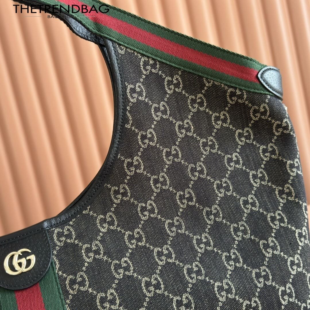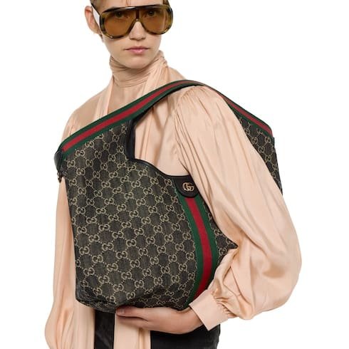 Description Gucci Giglio presents the black denim large tote bag, available exclusively online. The style is a tribute to the House’s Italian roots and the spirit of reinvention. Crafted in GG denim, this capacious bag features the Web trim, and is complete with a detachable pouch. Product Details Black and white GG denim Green and red Web canvas trim Light gold-toned hardware Black cotton lining Double G Detachable pouch Outside: D-rings 7.1″ handle drop Hidden magnetic closure 16.5″ (23.6″)W x 18.5″H x 6.3″D/41.9 cm (59.9 cm) × 47.0 cm × 16.0 cm Weight: 1.3lbs approximately Made in Italy Fits an iPad, iPhone, Airpods and small items