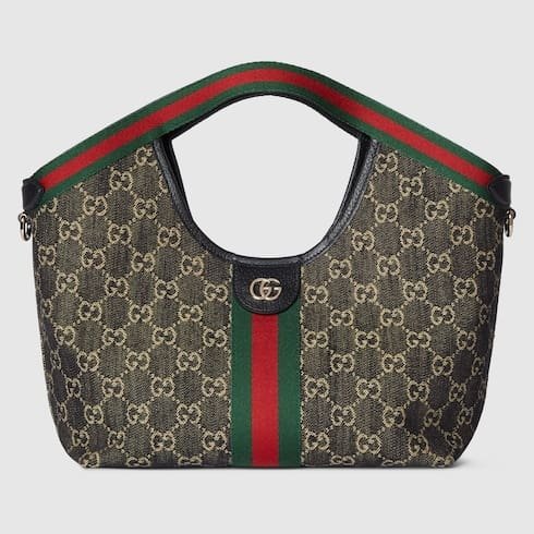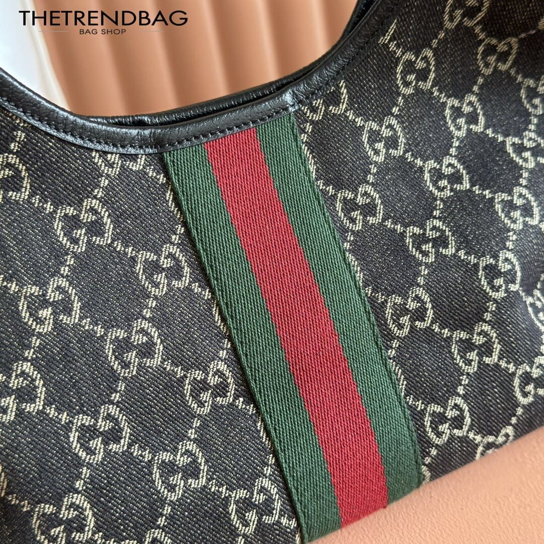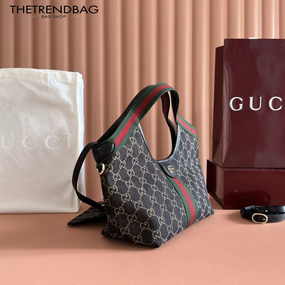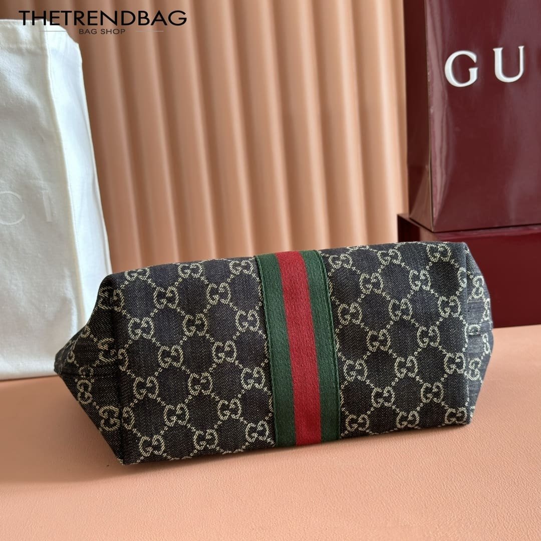 Description Gucci Giglio presents the black denim small tote bag, available exclusively online. The style is a tribute to the House’s Italian roots and the spirit of reinvention. Crafted in black GG denim, this versatile bag features the Web trim, and is complete with a detachable pouch. Product Details Black and white GG denim Green and red Web canvas trim Light gold-toned hardware Black cotton lining Double G Detachable pouch Outside: D-rings 5.9″ handle drop Detachable and adjustable leather shoulder strap drop: 21.3″ – 24.8″; length: 43.3″ – 50.8″ Hidden magnetic closure 9.8″W x 7.9″H x 5.9″D/25x20x15cm Weight: 1.1lbs approximately Made in Italy Fits an iPad, iPhone, Airpods and small items