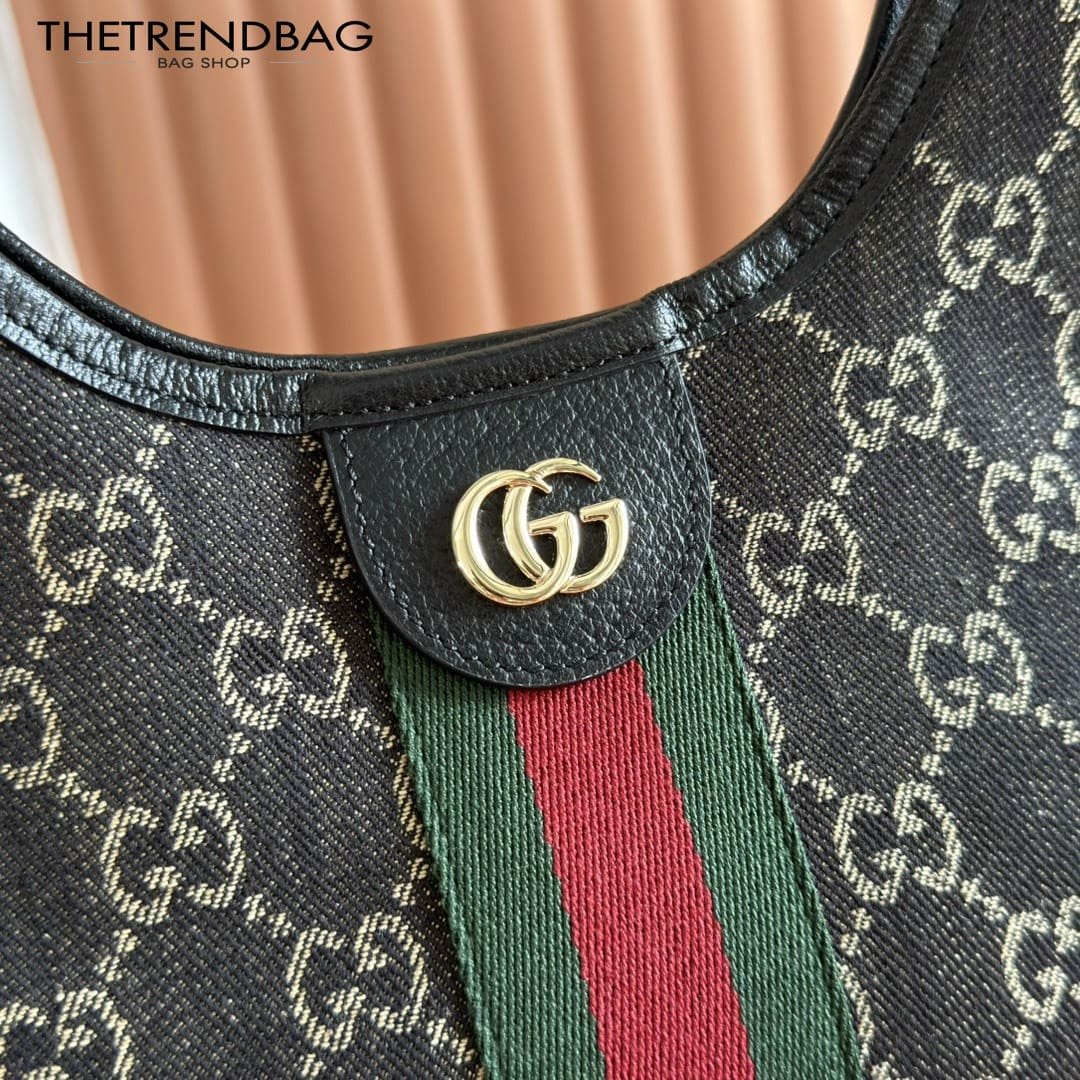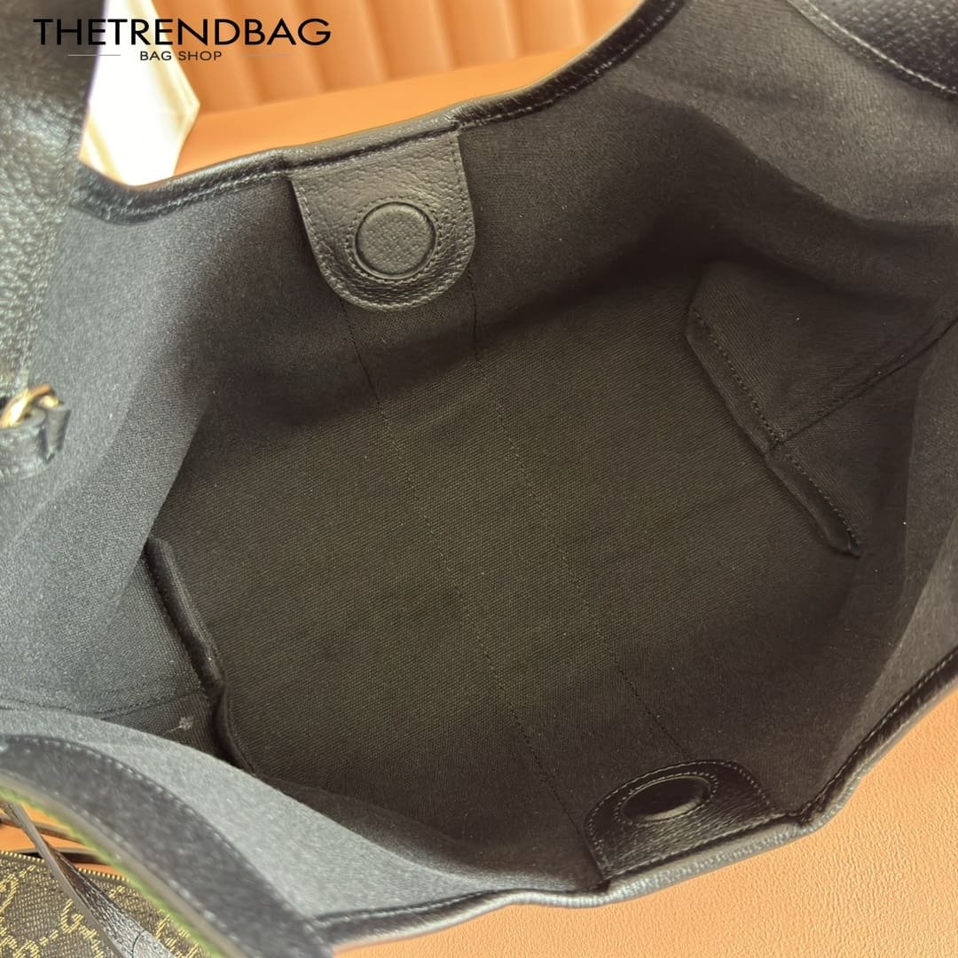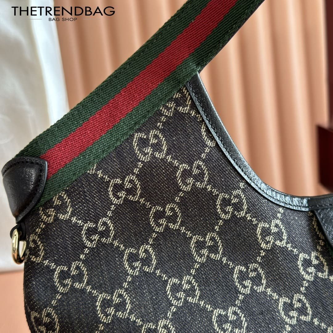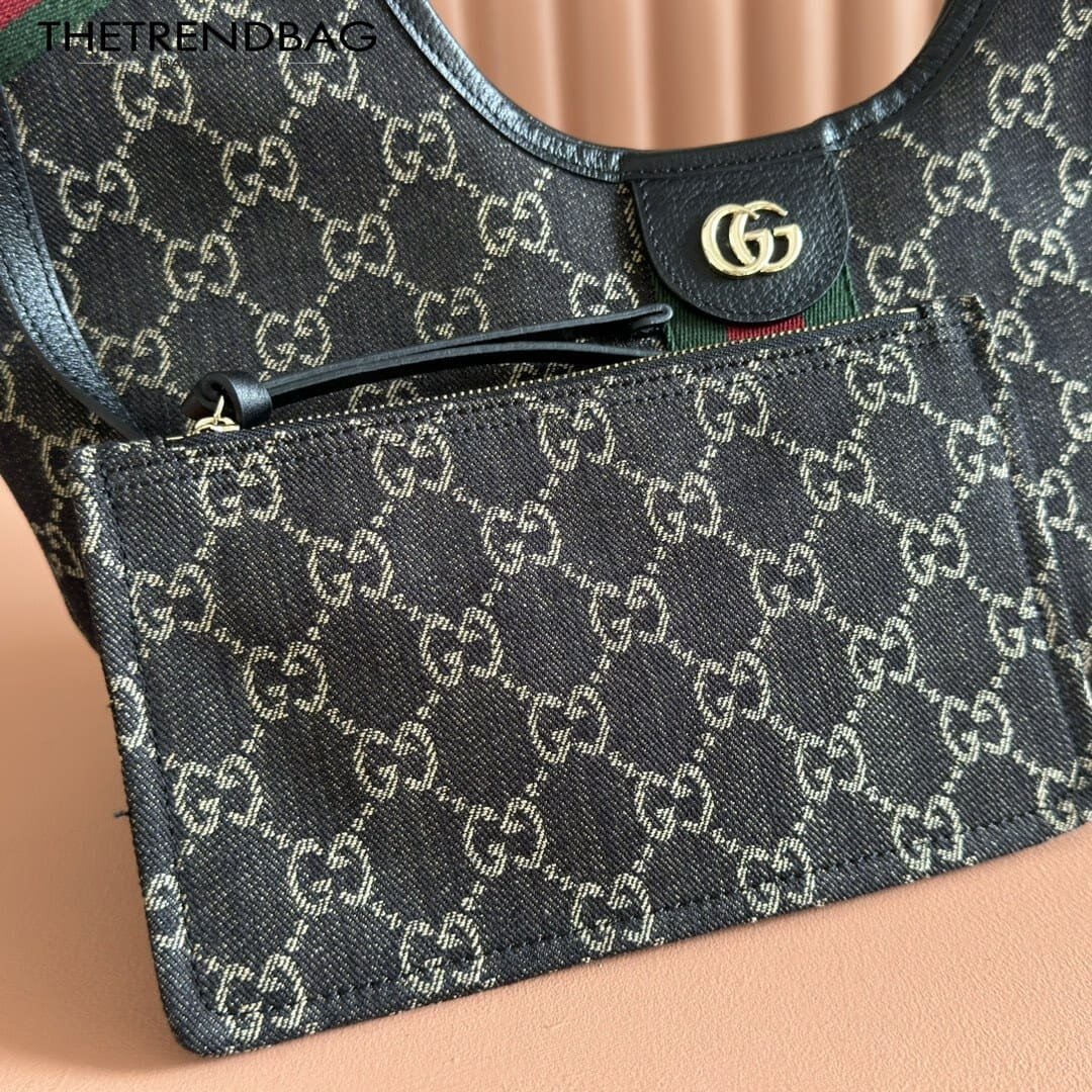 Description Gucci Giglio presents the black denim small tote bag, available exclusively online. The style is a tribute to the House’s Italian roots and the spirit of reinvention. Crafted in black GG denim, this versatile bag features the Web trim, and is complete with a detachable pouch. Product Details Black and white GG denim Green and red Web canvas trim Light gold-toned hardware Black cotton lining Double G Detachable pouch Outside: D-rings 5.9″ handle drop Detachable and adjustable leather shoulder strap drop: 21.3″ – 24.8″; length: 43.3″ – 50.8″ Hidden magnetic closure 9.8″W x 7.9″H x 5.9″D/25x20x15cm Weight: 1.1lbs approximately Made in Italy Fits an iPad, iPhone, Airpods and small items