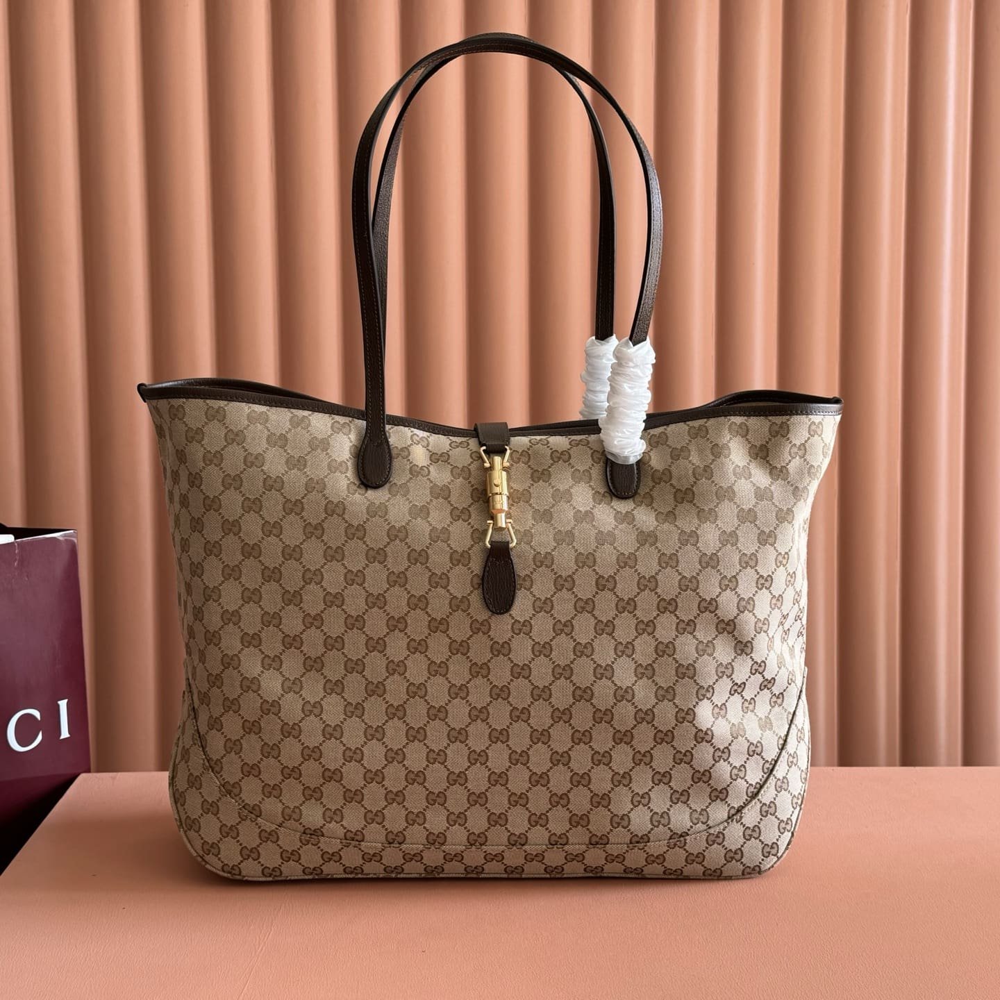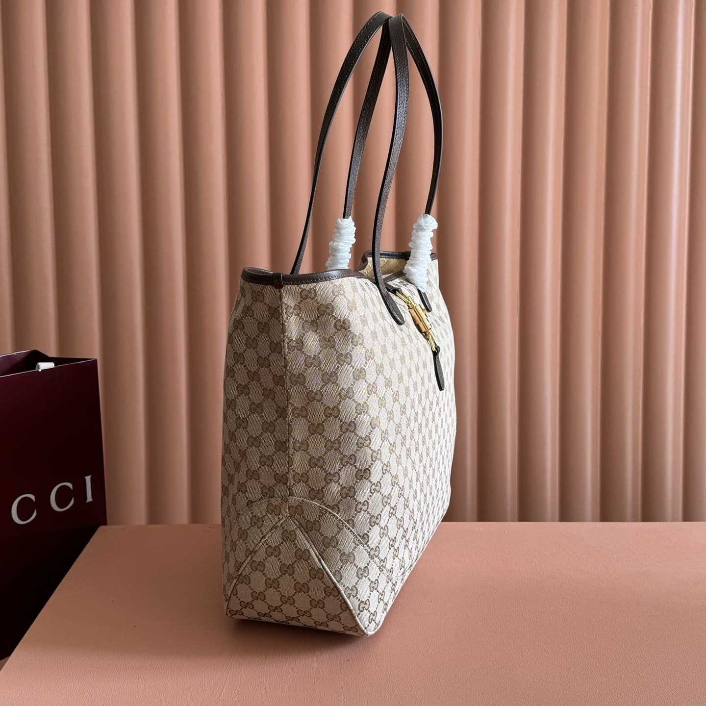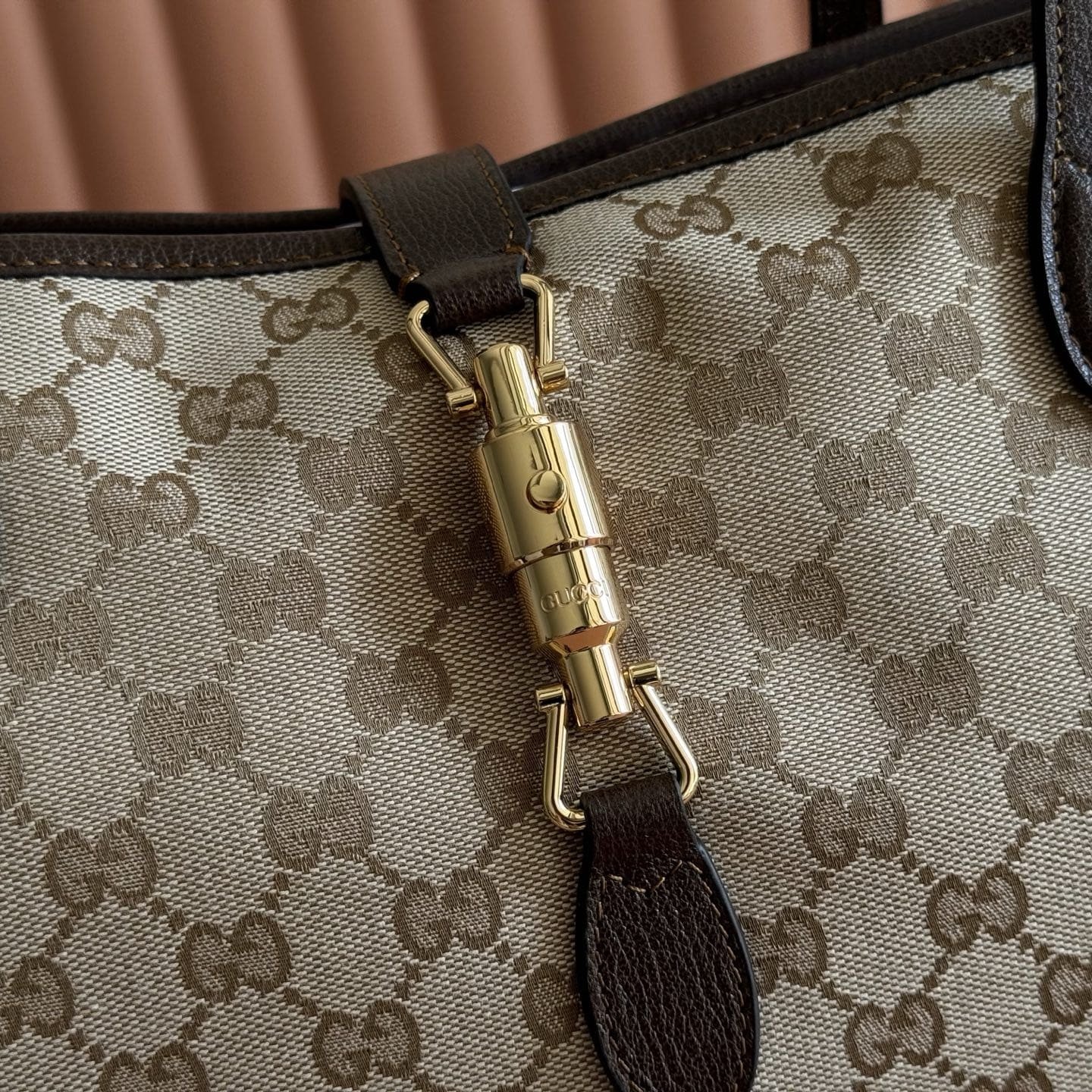 Description Introducing Spring Summer 2026. This new Gucci Jackie tote is crafted from structured yet lightweight GG canvas, and reveals a lining with the Diamante motif taken from the archive. Sand and dark brown GG canvas Dark brown soft leather trim Gold-toned hardware Sand canvas lining with Diamante motif “Made in Italy by Gucci” logo under the piston closure strap Inside: 1 zip pocket 11″ handle drop Piston closure 17.7″W x 11″H x 4.7″D Weight: 1.27lbs, approximately Made in Italy Fits up to a 13″ laptop, iPad, A4 notebook, and small items