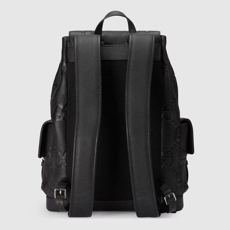 Description The all-black jumbo GG design returns for Pre-Fall 2023 atop a selection of leather luggage pieces. A reinterpretation of Guccio Gucci’s initials, the motif is an evergreen of the House that appears prominently in maxi size for an eye-catching logo feel. This backpack in the emblematic leather features multiple pockets and easy wear shoulder straps. Black jumbo GG leather Cotton linen lining Exterior: 2 side pockets with buckles and additional magnetic snap closure Interior: padded Iaptop case and 2 smartphone cases Top handle with 1.75″ drop; adjustable shoulder straps with padded mesh backing Flap closure with buckles and additional magnetic snaps 13.4″W x 16.2″H x 4.7″D/34 x 41 x 12cm Weight: 3.3lbs Made in Italy The model is 6’1″ tall
