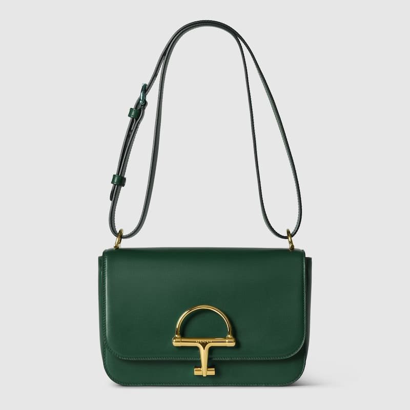 Description In the Fall Winter 2025 collection, the Gucci Siena small shoulder bag carries forward the evolution of the Horsebit, a signature code that is inherently Gucci. Crafted from fine smooth leather, its structured silhouette is defined by the half Horsebit clasp, a distinctive detail first introduced in the 1970s. Finished with gold-toned hardware and a lined interior featuring three gussets and a zip pocket. Green fine, smooth leather Gold-toned hardware Dark green leather lining Inside: 3 gussets and 1 zip pocket Shoulder strap: 23 – 25cm drop; 127cm length Half Horsebit snap closure W22.5cm x H14cm x D8cm Weight: approximately 0.7kg Made in Italy Fits iPhone Pro Max/Plus, Airpods, long wallet, and lipstick