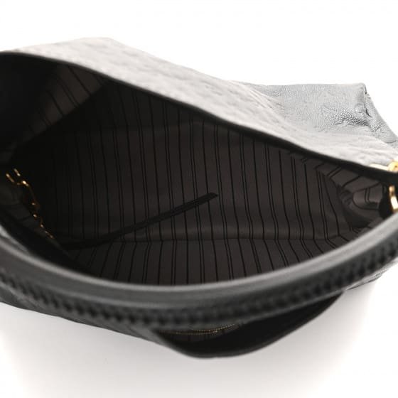 This is an authentic LOUIS VUITTON Empreinte Artsy MM in Black. This stunning hobo style shoulder bag is crafted of Louis Vuitton monogram embossed calfskin leather in black. This bag features a looping leather shoulder strap with woven braid detail and polished brass hardware. The top opens to a gray striped fabric interior with zipper and patch pockets.