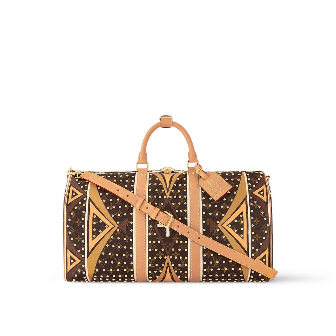 Description This Keepall Bandoulière 50 with its hand-painted Parfleche patterns and over 1000 rivets is the result of a creative collaboration with Dee Jay Two Bears and artists from the Dakota and Lakota nations, Jocy Little Sky and Trae Little Sky. The FA bag’s motifs and patterns are informed by the artworks of parfleche bags traditionally used to carry the clothing, food, and other items, with the Tópa cross signifying the four winds of the Earth. 50 x 29 x 23 cm (Length x Height x Width) Parfleche coated canvas Cowhide-leather trim Textile lining Gold-toned hardware Cabin size Double zip closure Inside zipped pocket Print-and-rivets pattern Padlock Removable name tag Key bell Strap: Removable, adjustable Strap Drop: 36.0 cm Strap Drop Max.: 50.0 cm Handle: Double