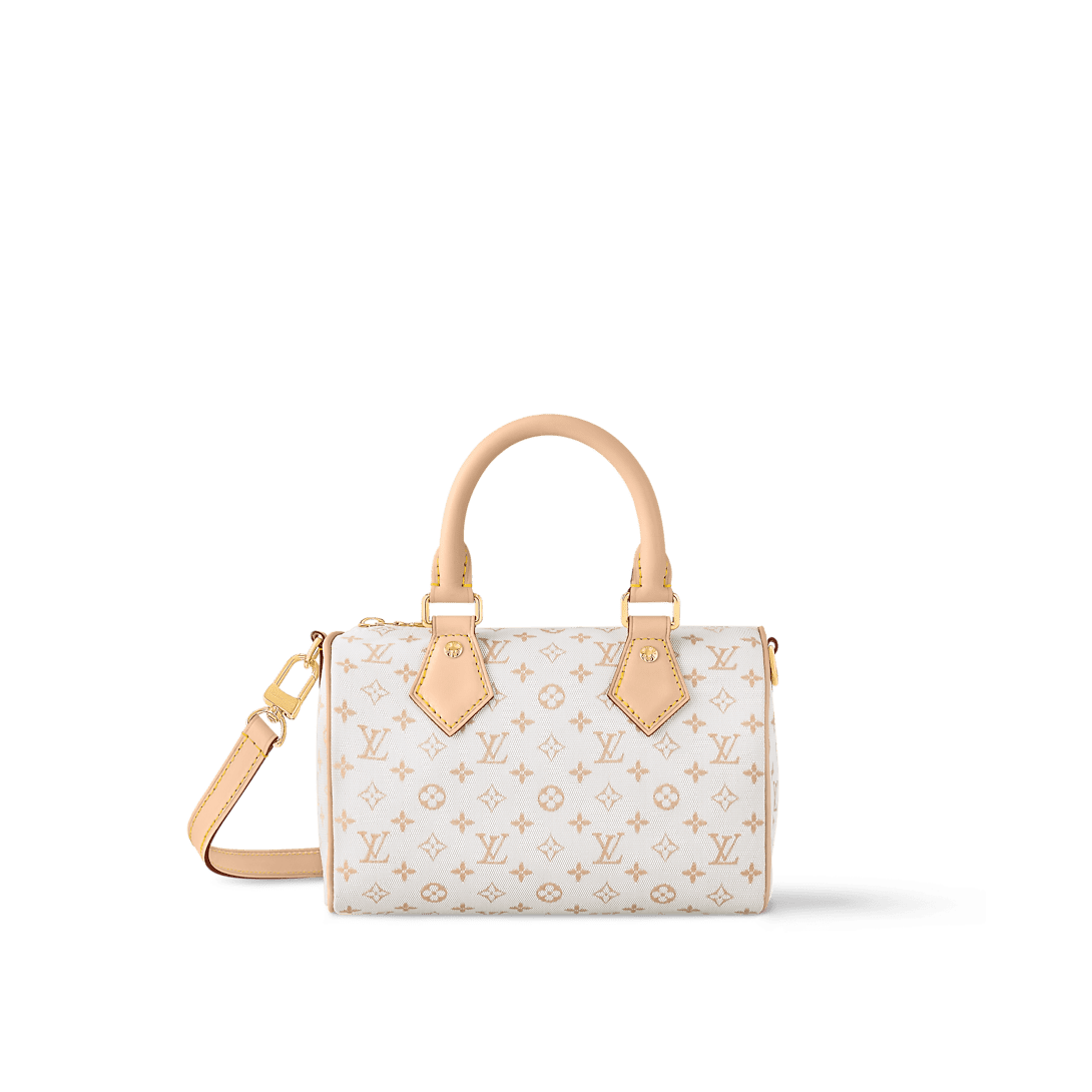 Description This Speedy Bandoulière 20 is crafted from supple polyamide, jacquard woven with the House’s latest Monogram Mini motif. The distinctive shape has two rolled-leather handles, plus a detachable and adjustable strap so it can be worn multiple ways. Signature details include the natural cowhide trims and gold-toned padlock, acting as markers of craftsmanship to those in the know. 8.1 x 5.3 x 4.7 inches (Length x Height x Width) Mastic Cream Polyamide Cowhide-leather trim Textile lining Gold-toned hardware Padlock Inside flat pocket Double zipped closure Strap:Removable, adjustable Strap drop:19.3 inches Strap drop max:21.3 inches Handle:Double