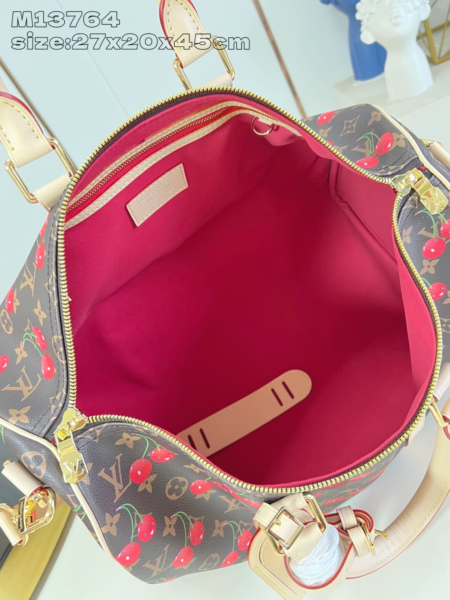 Description The iconic Keepall Bandoulière 45 is playfully revisited as part of the re-edition of the Louis Vuitton x Takashi Murakami collection. The House’s classic Monogram canvas is scattered with luscious cherry motifs in the renowned Japanese artist’s colorful aesthetic, which is complemented by a bold red lining. The emblematic lateral bands, top handles and adjustable strap are highlighted in elegant natural leather, while golden hardware completes the look. 17.7 x 10.6 x 7.9 inches/45x2720cm (Length x Height x Width) Cabin size Monogram coated canvas Cowhide-leather trim Microfiber lining Gold-toned hardware Double zip closure Inside zipped pocket Padlock Name tag (hot stamping available) Strap:Removable, adjustable Strap drop:14.2 inches Strap drop max:19.7 inches Handle:Double