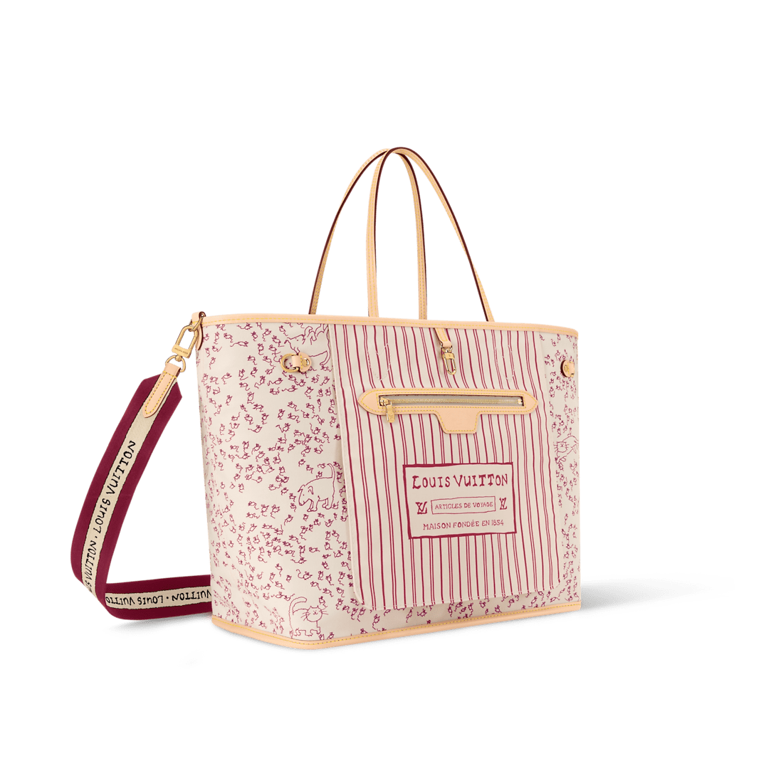 Description This edition of the Neverfull Inside Out GM unites heritage details with the artistic talent of American Vogue’s former Creative Director at Large, Grace Coddington. Part of the LV Travels With collection, the reversible tote showcases classic Monogram canvas on one side, and an exclusive cat-print on the reverse. The textile strap and iconic Louis Vuitton label are reimagined in Coddington’s handwriting, adding a personal and unique finishing touch. 15.4 x 12.6 x 7.5 inches (Length x Height x Width) Monogram Beige Coated canvas Cowhide-leather trim Textile lining Gold-toned hardware Hook closure 1 inside flat printed zipped pocket 2 side laces 2 side hooks Fits: 13-inch laptop, smartphone,earphones, Zippy wallet, keys Strap:Removable, not adjustable Strap drop:16.5 inches Handle:Double