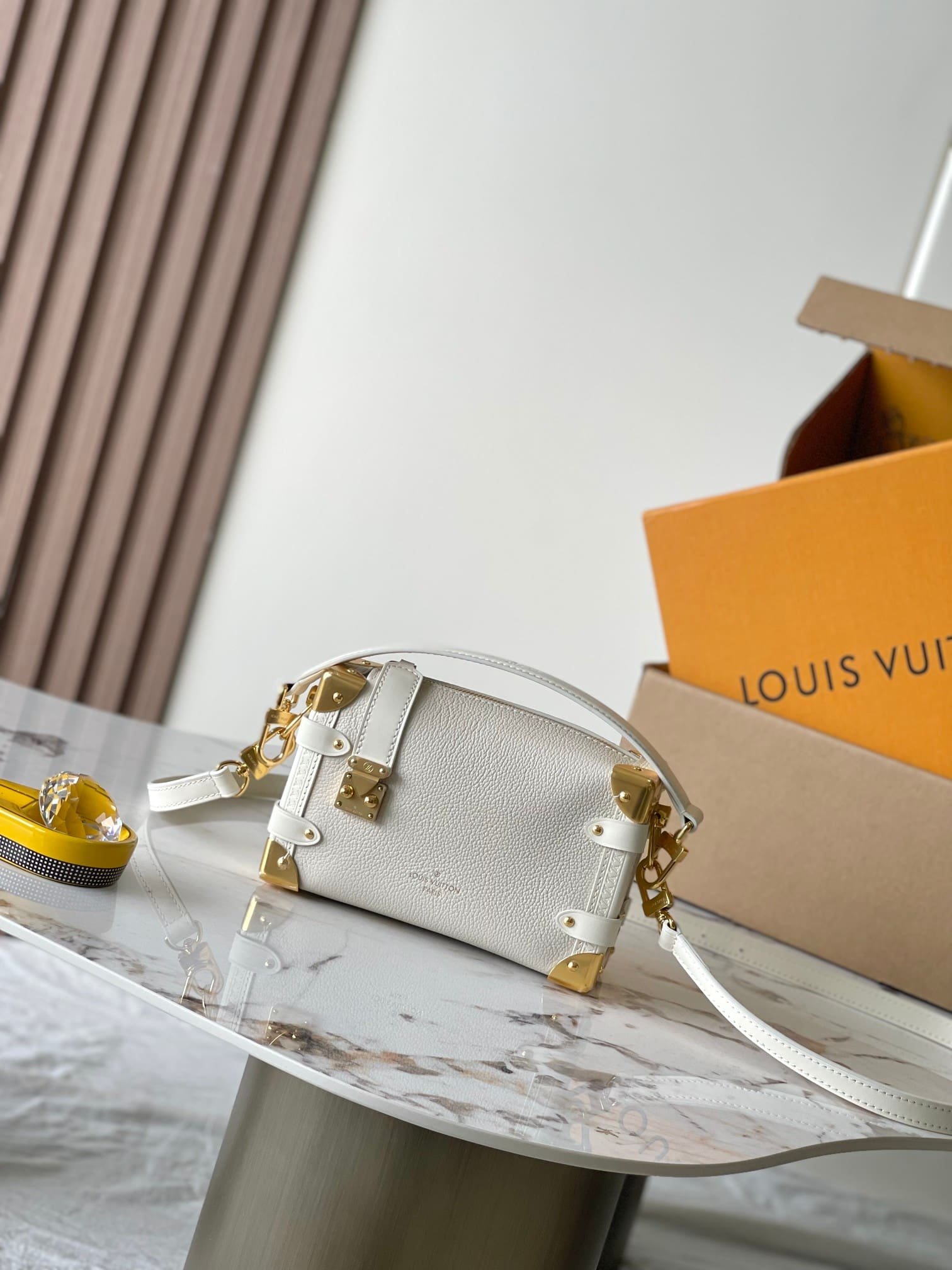 Description This Side Trunk small handbag is crafted from grained cowhide leather and features an S-lock closure and corner details, reflecting the inspiration of the brand’s traditional hard-sided trunks. The leather handle and adjustable leather shoulder strap are both detachable, offering multiple carrying options. It can accommodate a wallet, a large smartphone, keys, and lipstick. 12.5 x 7.5 x 19 cm (Height x Width x Length) Grained cowhide leather Smooth cowhide leather trim Textile lining Metal hardware Zip closure with S-lock Suitable for a short wallet, iPhone 14 Pro Max, keys, AirPods Pro, and lipstick Strap: Removable, adjustable Strap drop: 50.0 cm Adjustable strap drop: 60.0 cm Handle: Single handle, removable