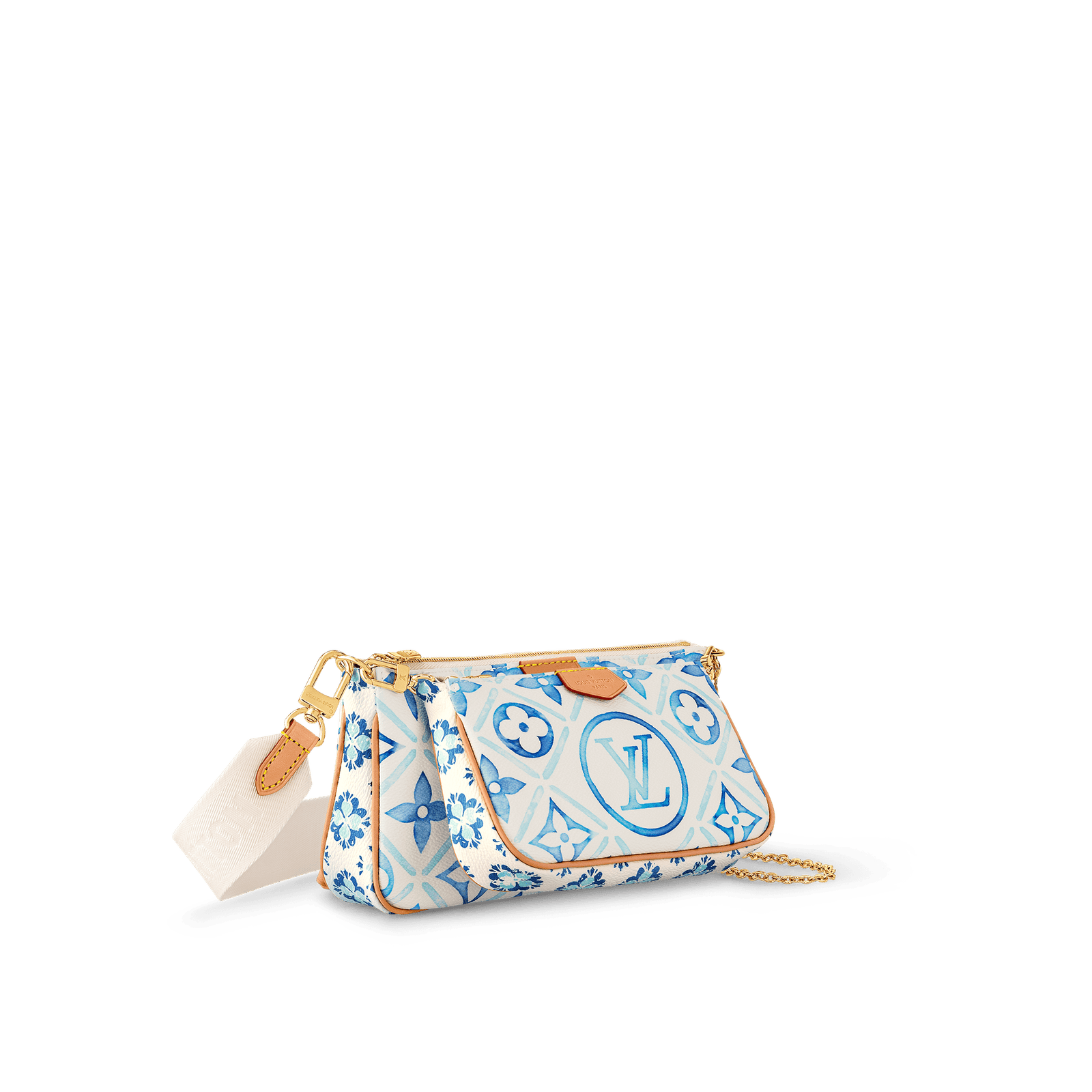Made in summer Monogram Tiles canvas from the LV By The Pool collection, the Multi Pochette Accessoires consists of two zippered pockets that clip together to add a hybrid twist to the classic tote. A wide, removable and adjustable textile shoulder strap and gold-tone chain allow for different looks and carrying options.