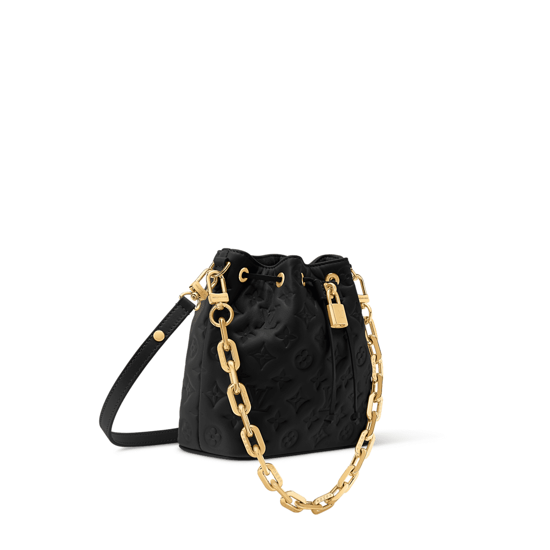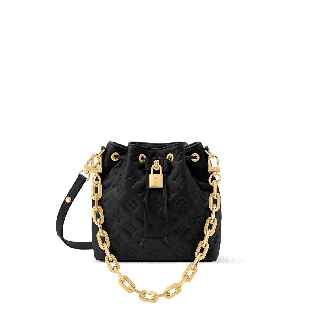 Description Introducing the latest edition to the Coussin family, the Bucket handbag offered in sophisticated Monogram-embossed lambskin. A feminine day-to-evening option, it is adorned with gold-toned hardware, including a signature LV padlock and a removable Coussin chain. The drawstring closure is both functional and stylish, and complements the bag’s multiple carry options. 20 x 20 x 10 cm (Length x Height x Width) Black Lamb leather Cowhide-leather trim Microfiber lining Gold-toned hardware 1 removable LV Chunky chain Fits: smartphone, earphones, Victorine wallet, keys, lipstick Strap: Removable, adjustable Strap drop:67.0 cm Strap drop max:116.0 cm Chain: Removable Chain drop:50.0 cm Handle: Single This reference is either Made in France, Spain, Italy or in the US.