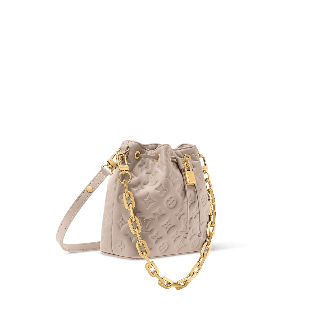 Description The Coussin family introduces this trendy Bucket handbag, offered in a chic Beige colorway that transcends seasons. Made from Monogram-embossed lambskin, it is adorned with gold-toned hardware, including a signature LV padlock and a removable Coussin chain. The drawstring closure is both functional and stylish, and complements the bag’s multiple carry options. 20 x 20 x 10 cm (Length x Height x Width) Beige Lamb leather Cowhide-leather trim Microfiber lining Gold-toned hardware 1 removable LV Chunky chain Fits: smartphone, earphones, Victorine wallet, keys, lipstick Strap: Removable, adjustable Strap drop:67.0 cm Strap drop max:116.0 cm Chain: Removable Chain drop:50.0 cm Handle: Single This reference is either Made in France, Spain, Italy or in the US.
