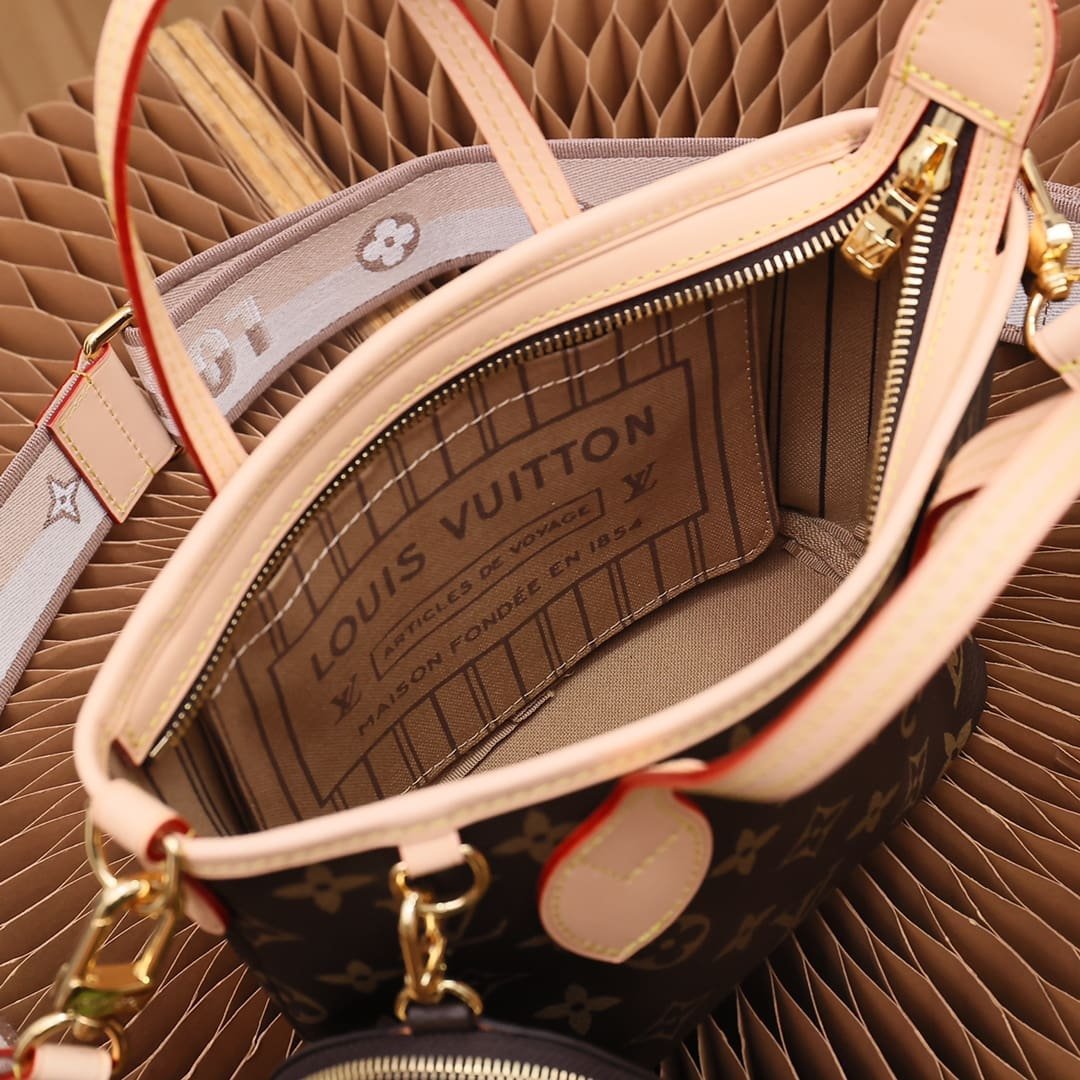 Description This season the House’s forever favorite, the Neverfull, gets reinvented as a mini-tote: the Neverfull BB handbag. This scaled-down version features an adjustable and detachable textile strap as well as a playful coin purse attached to a D-ring. It is just the right size for small essentials like a smartphone and compact wallet. 9.4 x 5.5 x 3.5 inches 24 x 14 x 9 cm (length x Height x Width) Beige Monogram coated canvas Natural cowhide-leather trim Textile lining Gold-color hardware Zip closure Inside flat pocket D-ring with removable coin purse Strap:Removable, adjustable Strap drop: 15.4 inches Strap drop max: 22.8 inches Handle:Double Video Player 1 Media error: Format(s) not supported or source(s) not found Download File: https://images.thetrendbag.com/2025/06/1.mp4 00:00 00:00 00:00 Use Up/Down Arrow keys to increase or decrease volume.