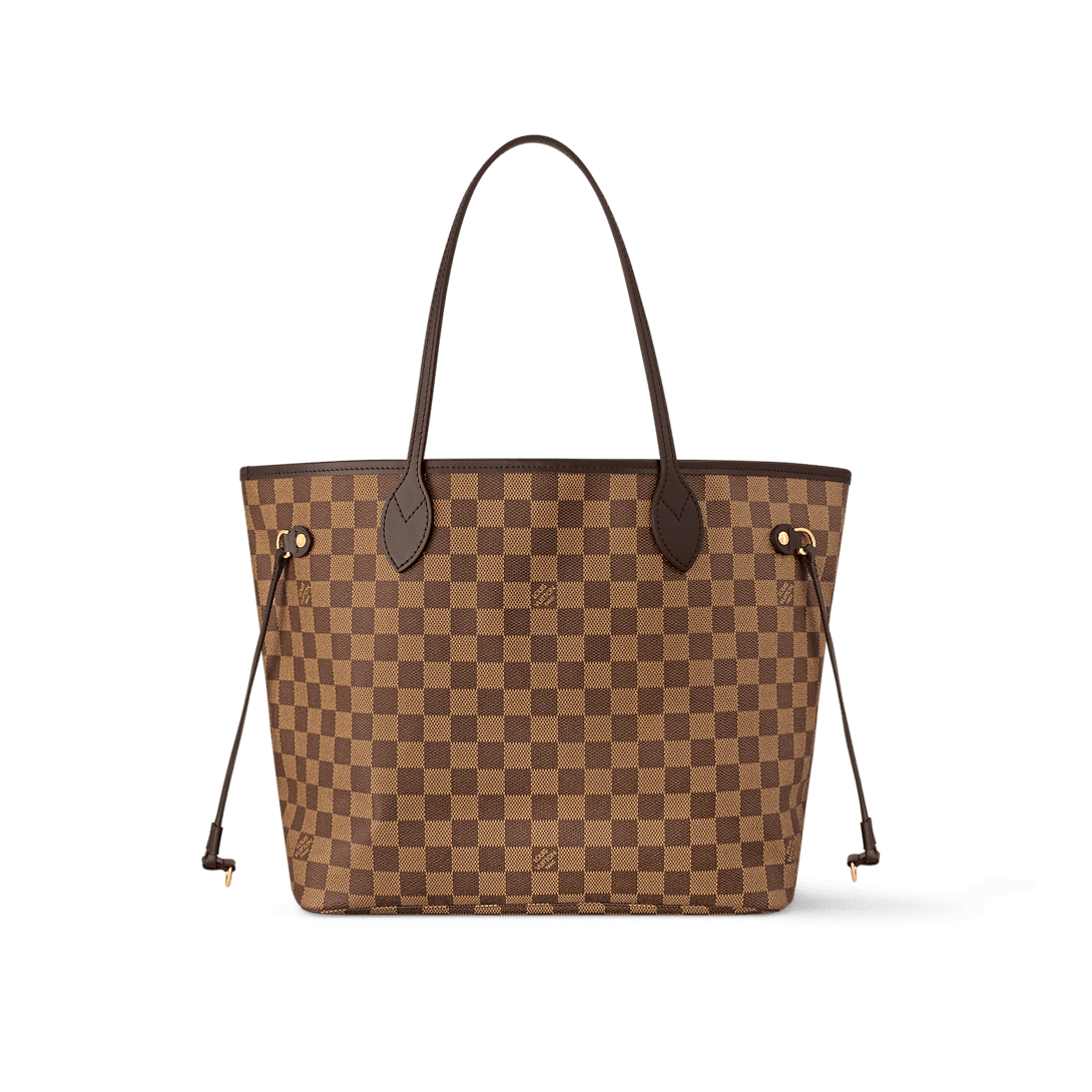 Description The Neverfull MM tote unites timeless design with heritage details. Elegant in Damier Ebene canvas with natural cowhide trim, it is roomy but not bulky, with side laces that cinch for a sleek allure or loosen for a casual look. Slim, comfortable handles slip easily over the shoulder or arm. Lined in colorful textile, it features a removable pouch which can be used as a clutch or an extra pocket. 31 x 28 x 14 cm (length x height x width ) Rose Ballerine Pink Damier Ebene coated canvas Natural cowhide-leather trim Striped textile lining Gold-color hardware 4 side laces Hook closure Flat, textile-lined zipped inside pocket Removable zipped pouch D-ring Fits: 13-inch laptop, smartphone, keys, Zippy Long Wallet Handle : Double