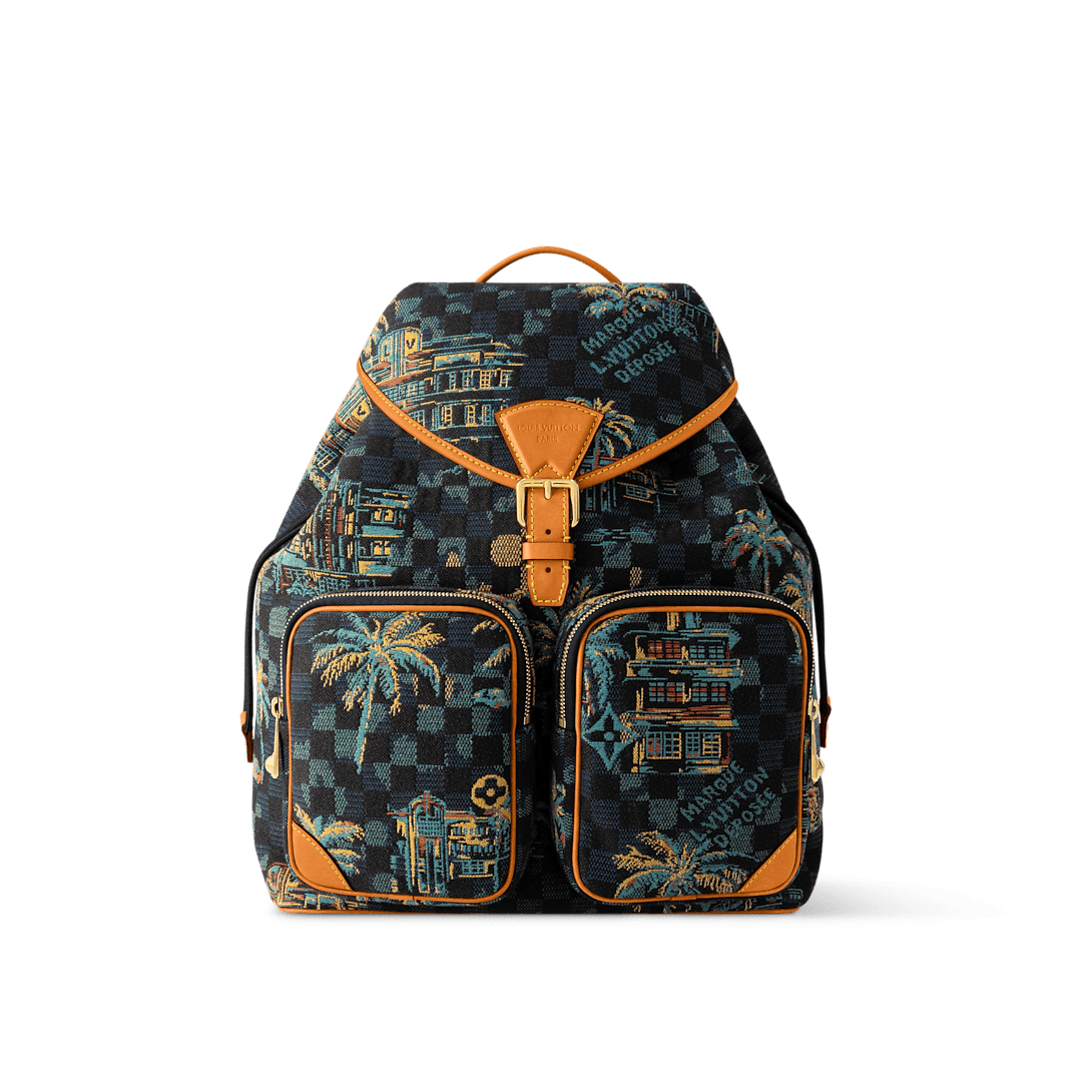 Description Recognizable by its rounded shape, drawstring closure, and comfortable shoulder straps, the Montsouris Cargo Backpack turns heads in jacquard cotton with a woven design depicting Miami and its vibrant nightlife. Finished with natural leather trim, the design takes on a slight vintage feel. The pack now features two outside pockets on the front, adding convenience. 13.4 x 15.7 x 6.7 inches/34.04 cm × 39.88 cm × 17.02 cm (Length x Height x Width) Marina Blue Damier Palm Trees jacquard cotton Cowhide-leather trim Textile lining Gold-toned hardware Drawstring and magnetic closure Adjustable shoulder straps 2 front zipped pocket Padded compartment 2 inside flat pockets Handle:Single