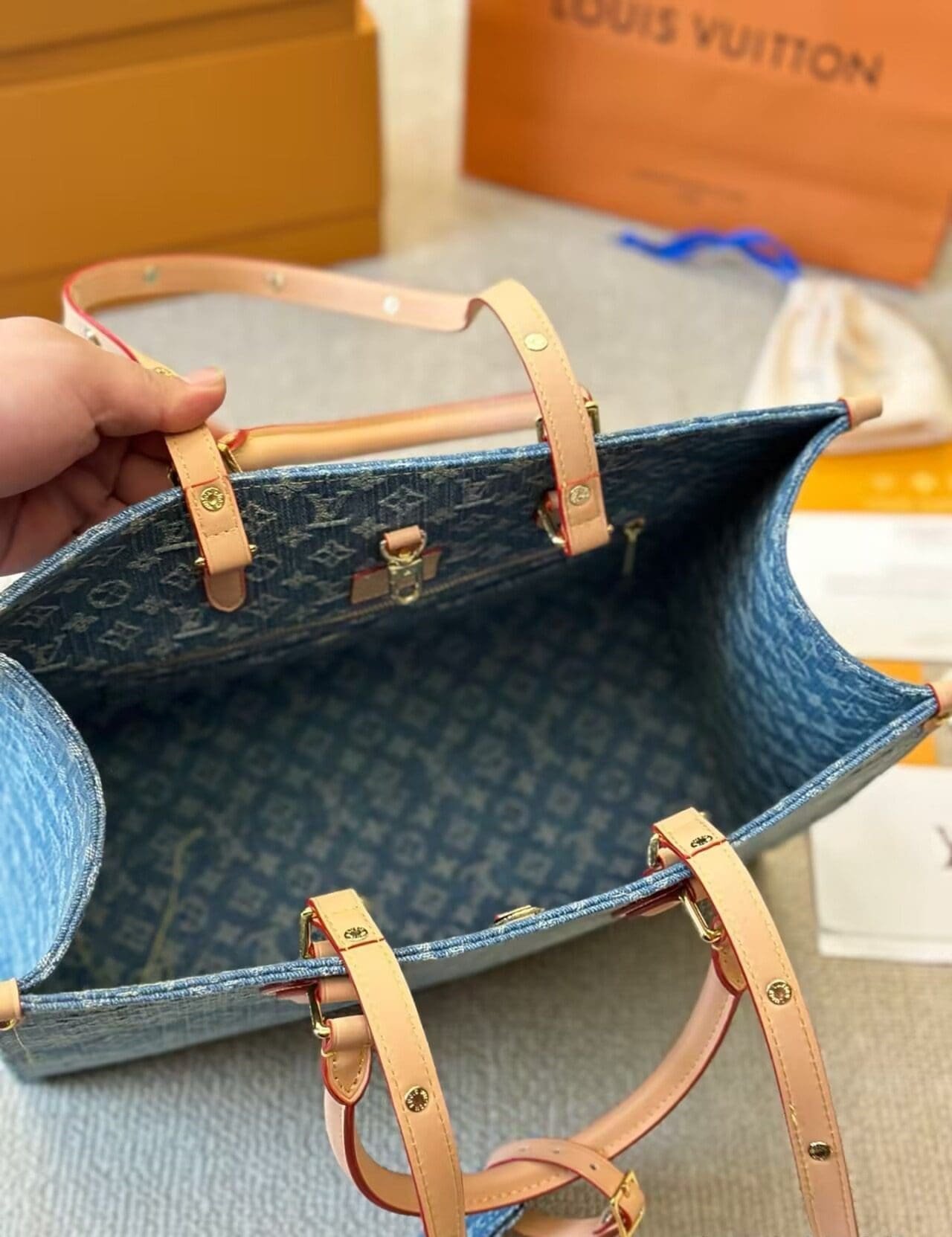 The OnTheGo MM tote bag is offered in new Monogram Denim canvas with natural cowhide-leather on the top handles and handle mounts. Thanks to the square shape, the OnTheGo has a large capacity and can hold a laptop. Its rolled-leather top handles and two longer shoulder straps enable carry options.